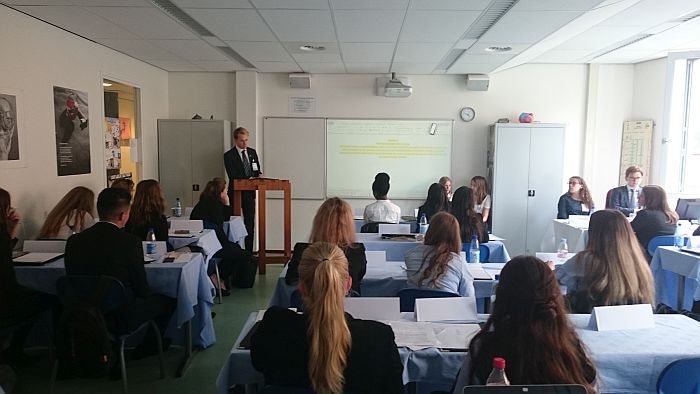 Im Vorfeld mussten sich alle Schüler natürlich intensiv auf diese Konferenz vorbereiten. Dies geschah hauptsächlich außerhalb der normalen Unterrichtszeit. Doch dank der großen Motivation waren schon bald alle Teilnehmer mit den diplomatischen Regeln der UN vertraut. Und so saßen dann die 10 Schüler des Pädagogiums am Freitag, 10.06., in einer für Botschafter passenden Bekleidung, in der „Opening Ceremony“ als Vertreter der Länder Urugay und Niederlande.
