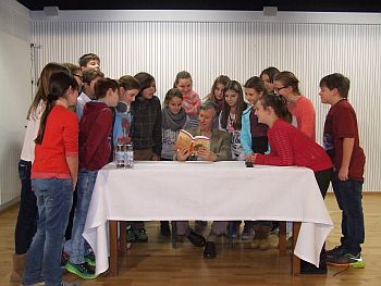 Mit großer Geduld beantwortete er deswegen auch die Fragen seiner Zuhörer: Seit wann sind Sie Autor? Wie lange braucht man um ein Buch zu schreiben? Welches ist Ihr Lieblingsbuch? Was das Leben vor 700 Jahren anstrengender als heute?