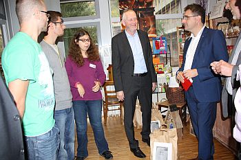 MdL Dr. Stefan Fulst-Blei (rechts) informiert sich in der Juniorfirma der SRH Stephen-Hawking-Schule bei den „Jufis“ und Schulleiter Thomas Bohnert über moderne Unterrichtsformen.