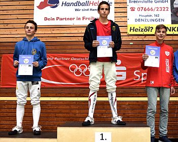 Cool und konzentriert arbeitend ließ er – außer in einem Vorrundenkampf – „nichts anbrennen“ und gewann das Finalgefecht gegen Constantin Berner (Waldkirch) sicher mit 15-8. Das brachte ihm 12 Ranglistenpunkte und Platz 1 auf der Rangliste des Südbadischen Fechterbunds ein.