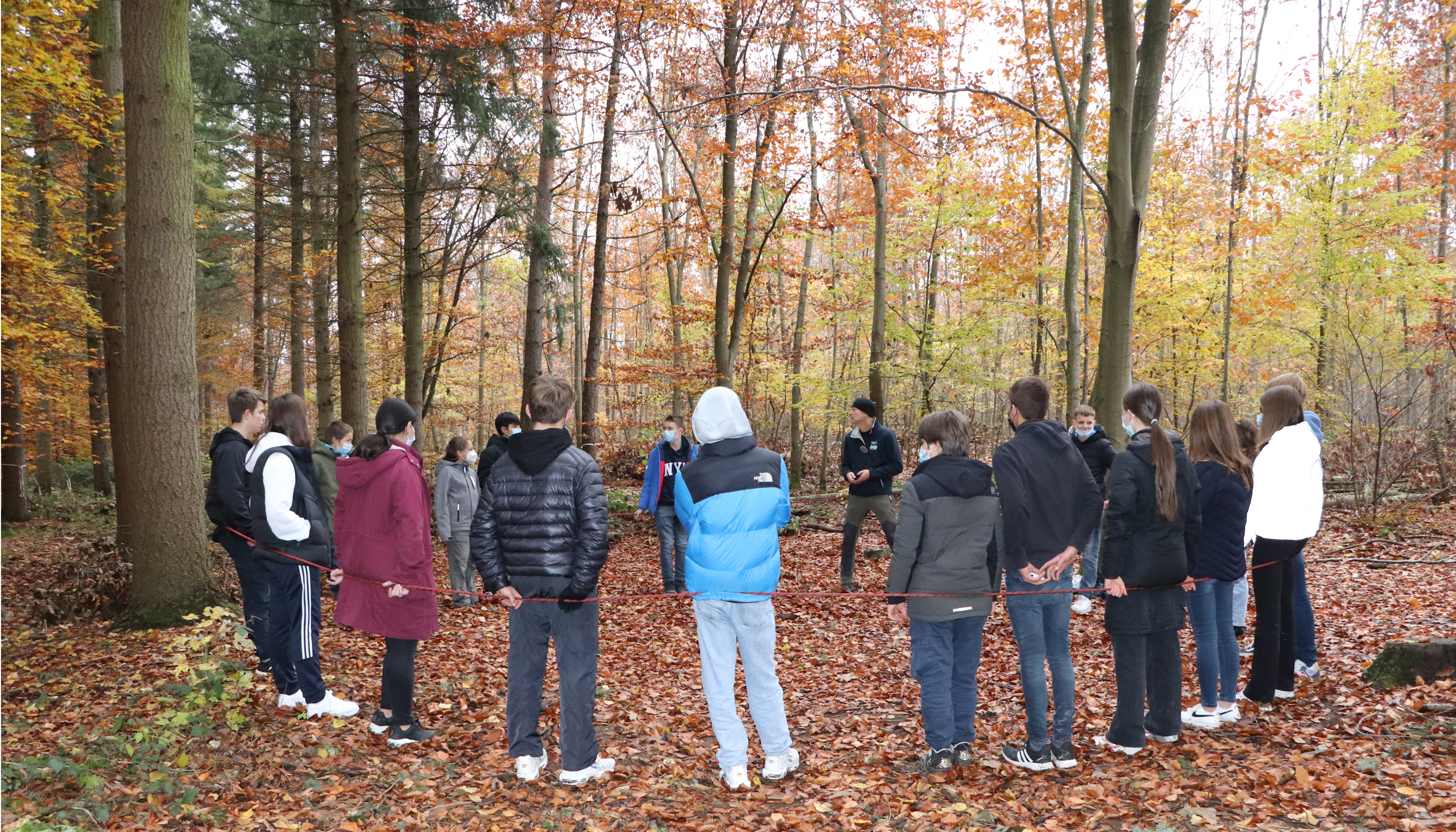 Das Waldklassenzimmer des Karlsruher Hartwalds ist sowohl im Herbst als auch im Frühjahr/Sommer außerschulischer Lernort. Insgesamt verbringen die Klassen dort rund 10 Unterrichtsstunden mit „ihrem“ Förster. Bewegung an der frischen Luft und das spielerische Erkunden der Funktionen des Waldes, im Hinblick auf Nachhaltigkeit und Wohlbefinden, sind für die Jugendlichen eine willkommene und lehrreiche Abwechslung. „Die Schülerinnen und Schüler freuen sich schon Tage im Voraus auf die gemeinsamen Spiele zur Gruppenentwicklung und ihre tierischen Klassenkameraden, wie Katze Hexe und Retriever-Hündin Emma.“, so Mittelstufenkoordinatorin Anne-Kathrin Wick. Und im Klassenzimmer sind die SchülerInnen und Schüler nach den Naturimpulsen auch mit Begeisterung bei praxisrelevanten Themen rund um beispielsweise gesunde Ernährung im Profil Soziales oder Steuern und Gehaltsberechnungen im Profil Wirtschaft dabei.
