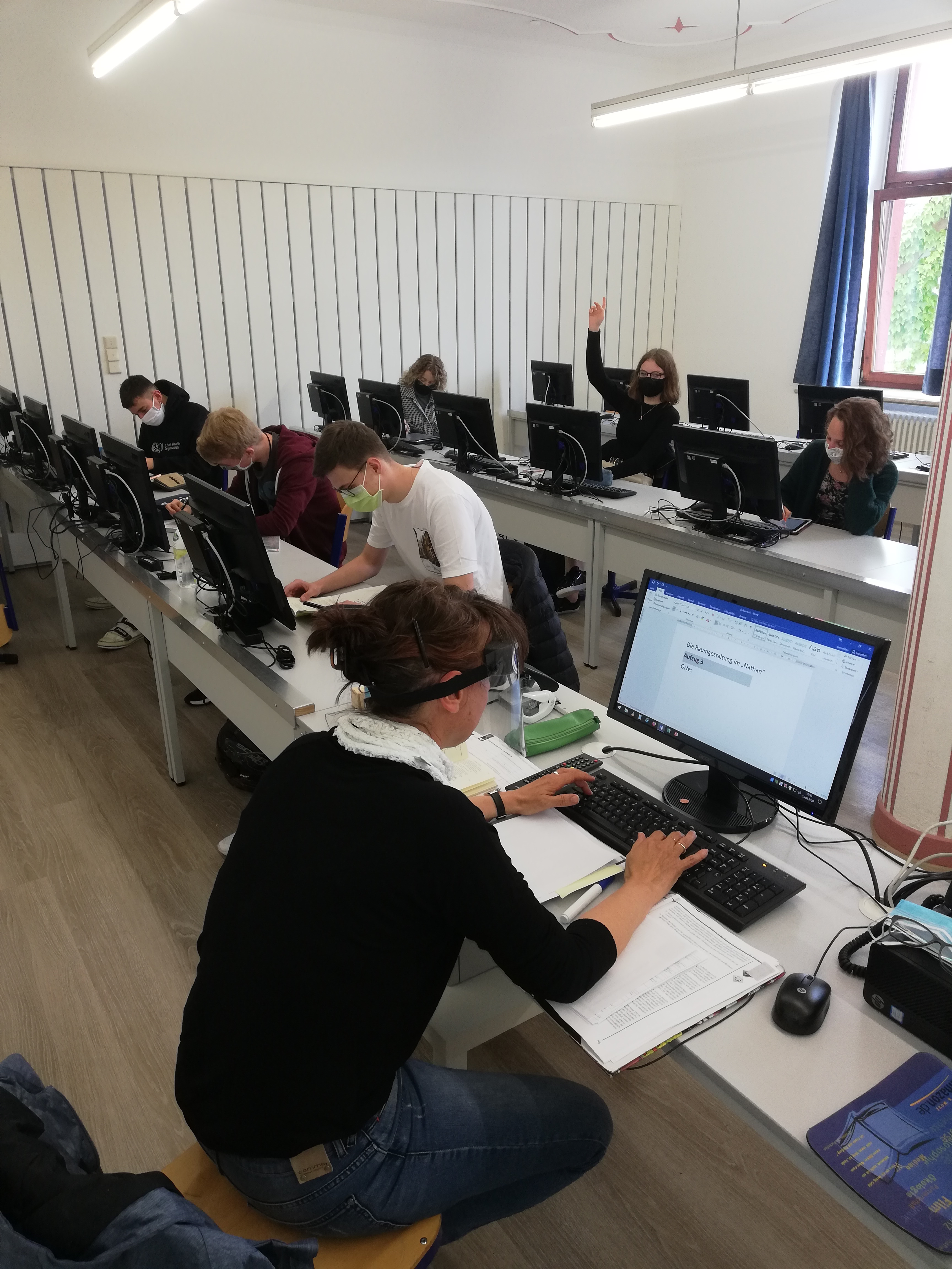 Mit der Möglichkeit, dass die Abschlussklassen des allgemeinbildenden Gymnasiums und der beruflichen Gymnasien wie auch die 9. und 10. Klassen der Realschulen seit dem 4. Mai wieder beschult werden durften, haben sich neue Herausforderungen ergeben: Dazu gehörte beispielsweise, dass neben Schüler*innen auch Lehrer*innen Risikogruppen angehören und dadurch bedingt Unterrichtsstunden in der Schule in gewohnter Weise als auch digital über TEAMS stattfinden. Hierzu wurde der Stundenplan angepasst und technische Geräte bzw. WLAN zur Verfügung gestellt, sodass die Schüler*innen beschult werden können. Das geschah in der einen Stunde eben digital und in der folgenden mitunter real, sodass die Schüler*innen zwischen den Welten wechselten. Dasselbe betraf aber auch die Kolleg*innen, die vor Ort die Abschlussklassen unterrichten durften, und in anderen Stunden ihre zu Hause gebliebenen Klassen digital mit Materialien in Telefon- und Videokonferenzen unterrichteten. Fest steht aber seit dem 15.06.2020, so betont es Dina Bissinger, Geografie- und Englischlehrerin: „Es ist schön, wenigstens einen Teil meiner Schüler*innen endlich wieder sehen zu können“. Dennoch galt es, dabei vieles zu beachten: Dazu gehörte unter anderem das Einhalten der Abstandsregel, die fehlende Nähe aufgrund der größeren Distanz im Unterricht und in den Pausen, andere Formen der Ausgabe der Mahlzeiten oder das Tragen des Mundschutzes in der Schule und im Unterricht. Trotz der vielen Gebote zeigten sich die Schüler*innen am ersten Tag froh, wieder in der Schule sein zu können, um auf eine andere Art und Weise, wieder Sozialkontakte haben und seine Freund*innen sehen zu können.