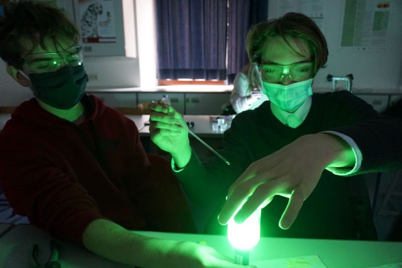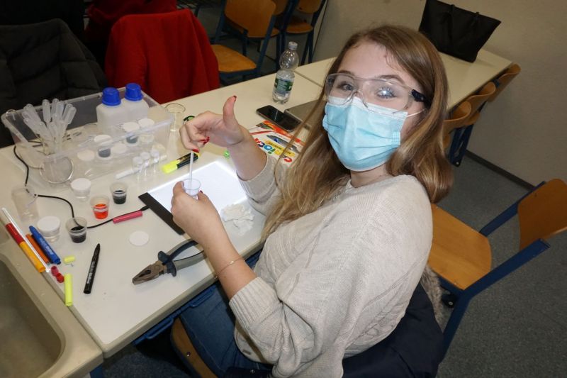 Digital zugeschaltet erläuterte Prof. Dr. Ducci die einzelnen Schritte der insgesamt vier Experimente, und die Schüler*innen machten fleißig mit. Dass es dabei spannende Ergebnisse zu bestaunen gab, zeigen die Bilder. Die Materialien dazu wurden vom Chemieverband zur Verfügung gestellt, und wer auch immer gedacht hat: „Chemie ist, wenn´s kracht und stinkt“, wurde eines Besseren belehrt: Kleine bunte Bubble-Tea-Bällchen entstanden in den Bechergläsern, die unter Zugabe weiterer Stoffe tolle Farbenspiele zeigten und unter dem Einfluss von UV-Licht spektakulär leuchteten. Die chemischen Prozesse, die sich dabei abspielten, waren Gegenstand der Vorbereitung der Onlinestunde und werden den Kurs auch in den kommenden Wochen noch weiter beschäftigen. Am Ende waren sich alle einig: Das war eine ganz besondere Chemiestunde!