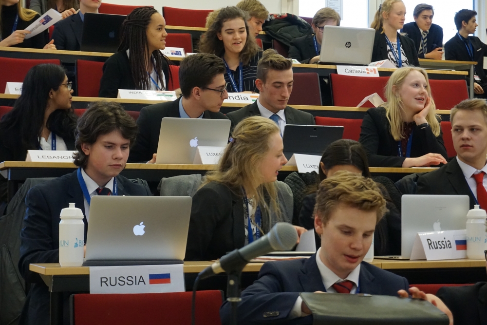 Am Mittwoch, 21.02. waren alle sehr erleichtert als der Generalsekretär die Konferenz eröffnete. Endlich konnten die SchülerInnen nach einer intensiven und monatelangen Vorbereitung zur Tat schreiten. Die selbst erstellten Resolutionen, an denen noch am Tag vorher bis spät in die Nacht gefeilt wurde, galt es durch die Ausschüsse zu bringen. Dabei mussten sie sich gegen mehr als 400 Delegierte von 25 Schulen aus drei Kontinenten, viele davon mit Englisch als Muttersprache, durchsetzen.