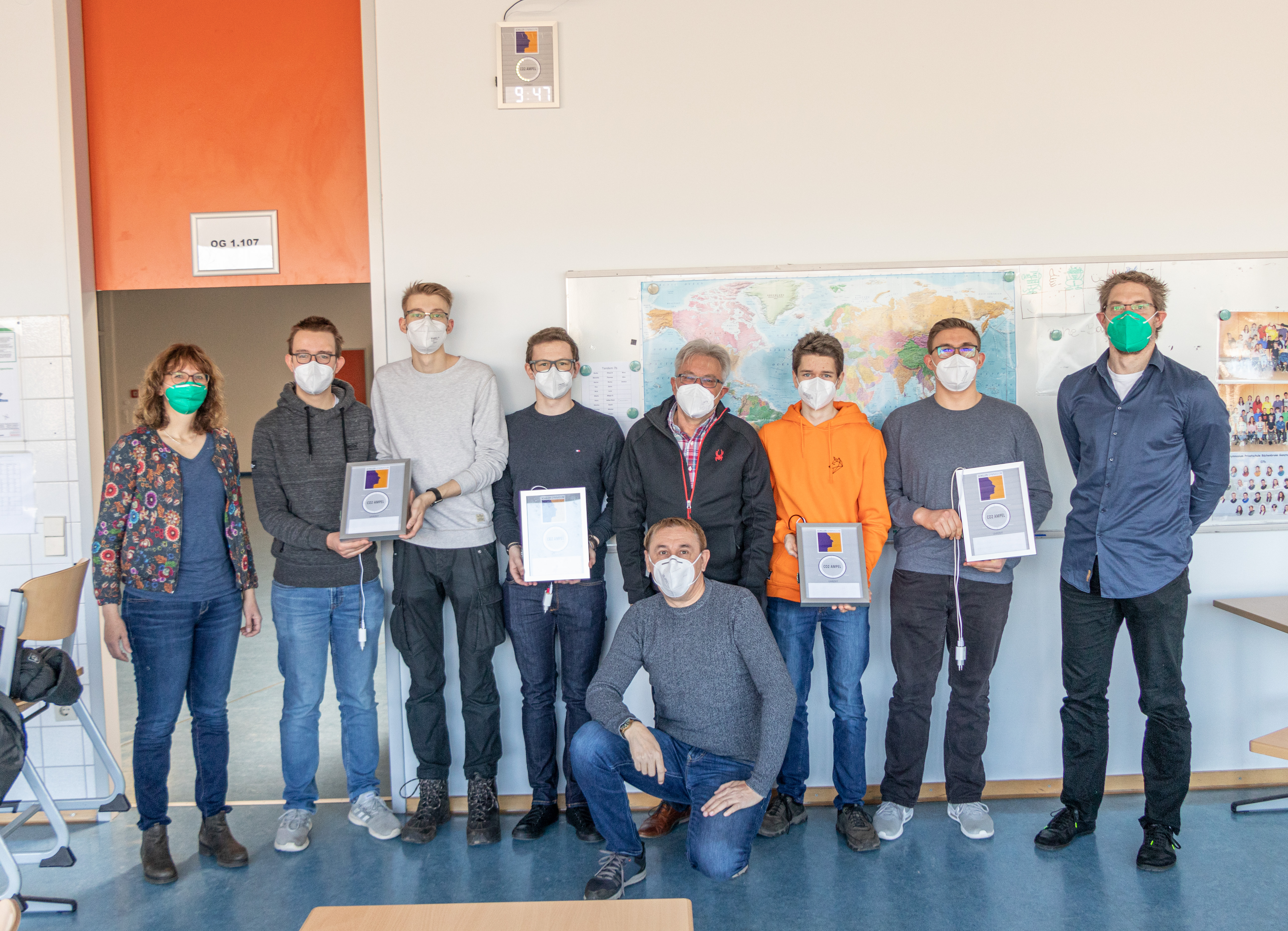 Fünf fleißige und technisch begabte Schüler der Jahrgangstufe 12 bauten zwischen Unterricht und Klausuren in ihrer Freizeit dreißig CO2-Ampeln mit integrierter Digital-Uhr. Die dazu nötigen Baumaterialien und die Kleinelektronik wurden von Herrn Davcik, Vater eines Schülers, sowie von der Schule finanziert und besorgt.