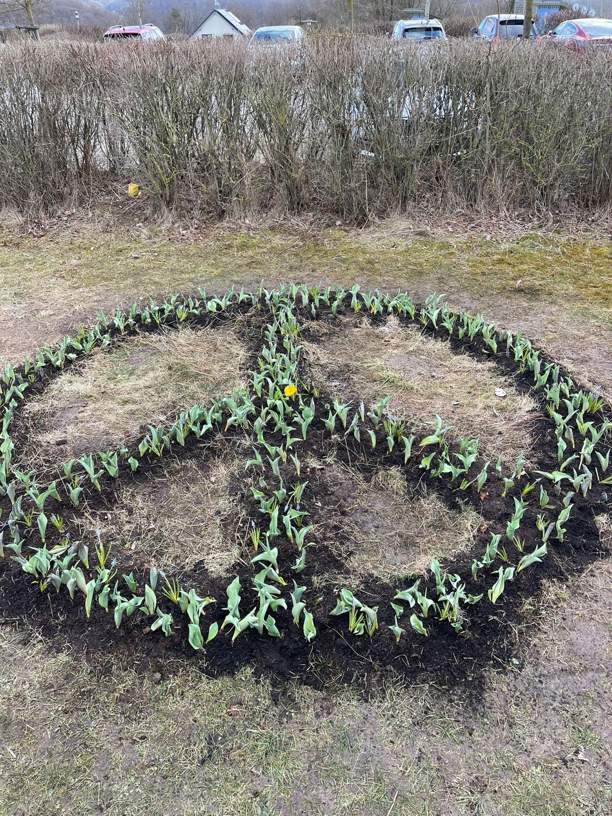 Alle gepflanzten Tulpen gemeinsam stellen das Friedenssymbol dar - als Zeichen gegen den Krieg in der Ukraine!