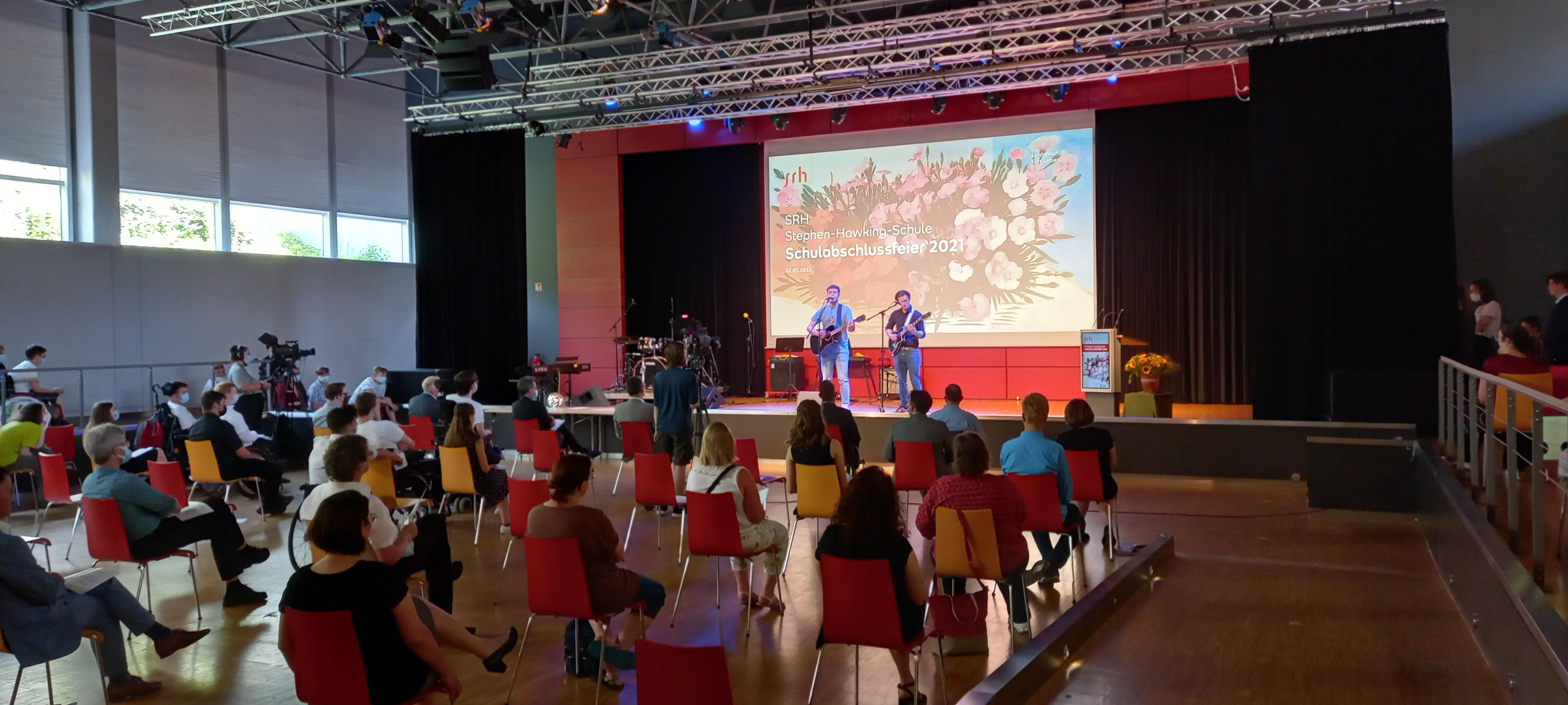 Dass man seinen Traum leben kann, beweisen die ehemaligen Schüler Louis Berton und Christopher Kose. Neben den Klassenbands der 8.5 und 9.5 unter Leitung von Petra Schostak gestalten die Songwriter den musikalischen Rahmen der hybriden Abschlussfeier für den kleinen Kreis aus Preisträgern für besondere schulische und soziale Leistungen und Lehr- sowie Betreuungskräften in der Aula und den vielen Absolventen, Eltern und Freunden, die wegen der Corona-Pandemie per Livestream in den Klassenzimmern oder zuhause mitfeiern.