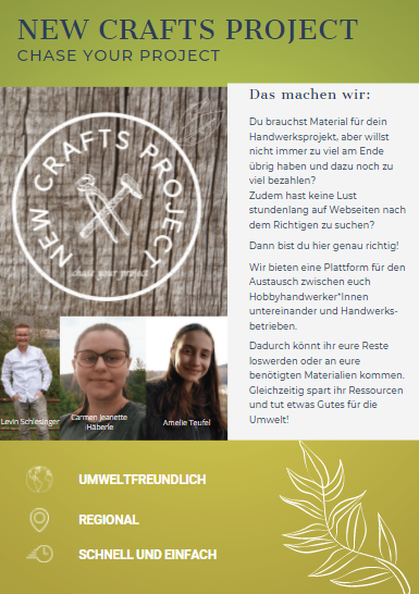 Lehrerin Hannah Hansmann, die schon im Jahr zuvor das ebenfalls siegreiche Team „Plasticcrasher“ der SRH Stephen-Hawking-Schule auf das Landesfinale vorbereitet hatte, ist glücklich: „Für den Wettbewerb in der Schule coachen wir die Teilnehmer, danach stellen wir sie fürs Finale nur noch frei. Eigenverantwortlich und selbständig erstellen sie einen Businessplan und planen Marketing und Vertrieb. Innerhalb von 3 Minuten Vortrag und 3 Minuten Antwortzeit müssen sie eine Expertenjury von ihrem Projekt überzeugen.“ Auch dieses Jahr wieder per Livestream, wirkte der Kampf um die besten Gründerideen auf dem Bildschirm wie ein Kopf-an-Kopf-Rennen. Das geschickt vorgestellte New Crafts Project punktete auch mit einem Flyer und QR Code zu Instagram.