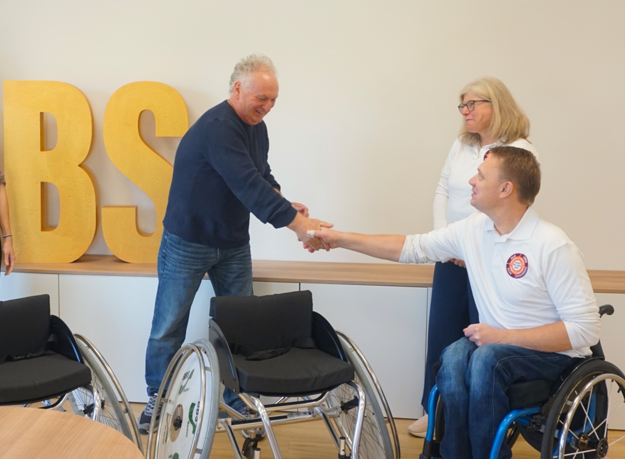 Foto: Übergabe der Rollstühle: Michael Eisele vom BBS (l.) gratuliert Ursula Stricker-Ellsiepen (m.) und Uli Süß, Trainer der Rollstuhlbasketballmannschaft der SHS (r.).