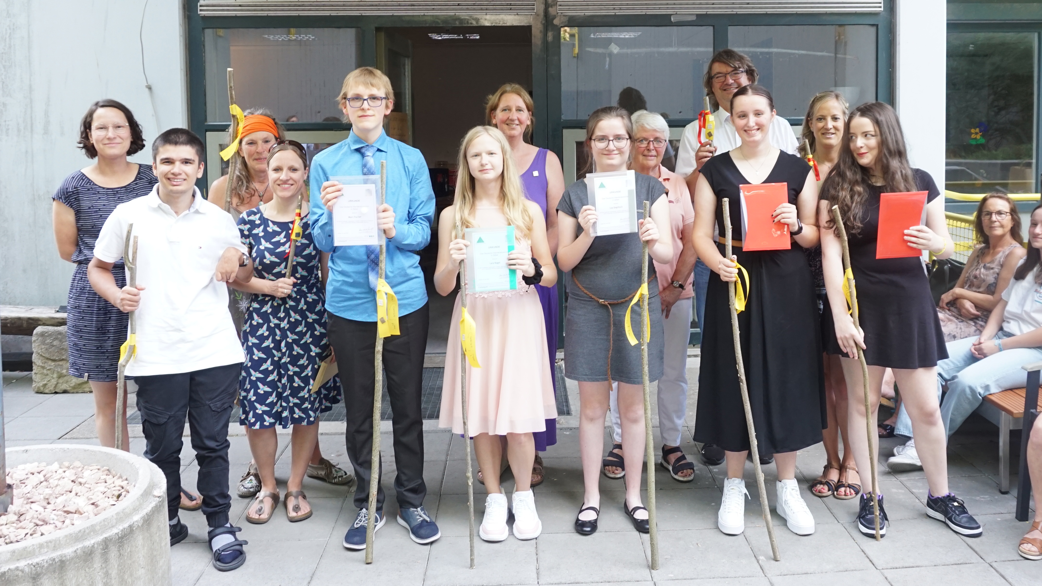 Im Rahmen der Bereichsabschlussfeier im Bildungsgang Förderschwerpunkt Lernen erhielten sechs Schüler:innen und fünf Lehrkräfte der SRH Stephen-Hawking-Schule eine Urkunde und das dazugehörige Wanderabzeichen des deutschen Wanderverbands in Form einer Wandernadel für die jeweils über 300 km zurückgelegte Wanderwegstecke in den Schuljahren 2021/2022 und 2022/2023.