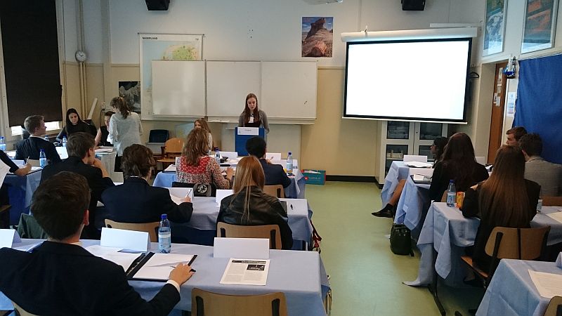 Im Vorfeld mussten sich alle Schüler natürlich intensiv auf diese Konferenz vorbereiten. Dies geschah hauptsächlich außerhalb der normalen Unterrichtszeit. Doch dank der großen Motivation waren schon bald alle Teilnehmer mit den diplomatischen Regeln der UN vertraut. Und so saßen dann die 10 Schüler des Pädagogiums am Freitag, 10.06., in einer für Botschafter passenden Bekleidung, in der „Opening Ceremony“ als Vertreter der Länder Urugay und Niederlande.