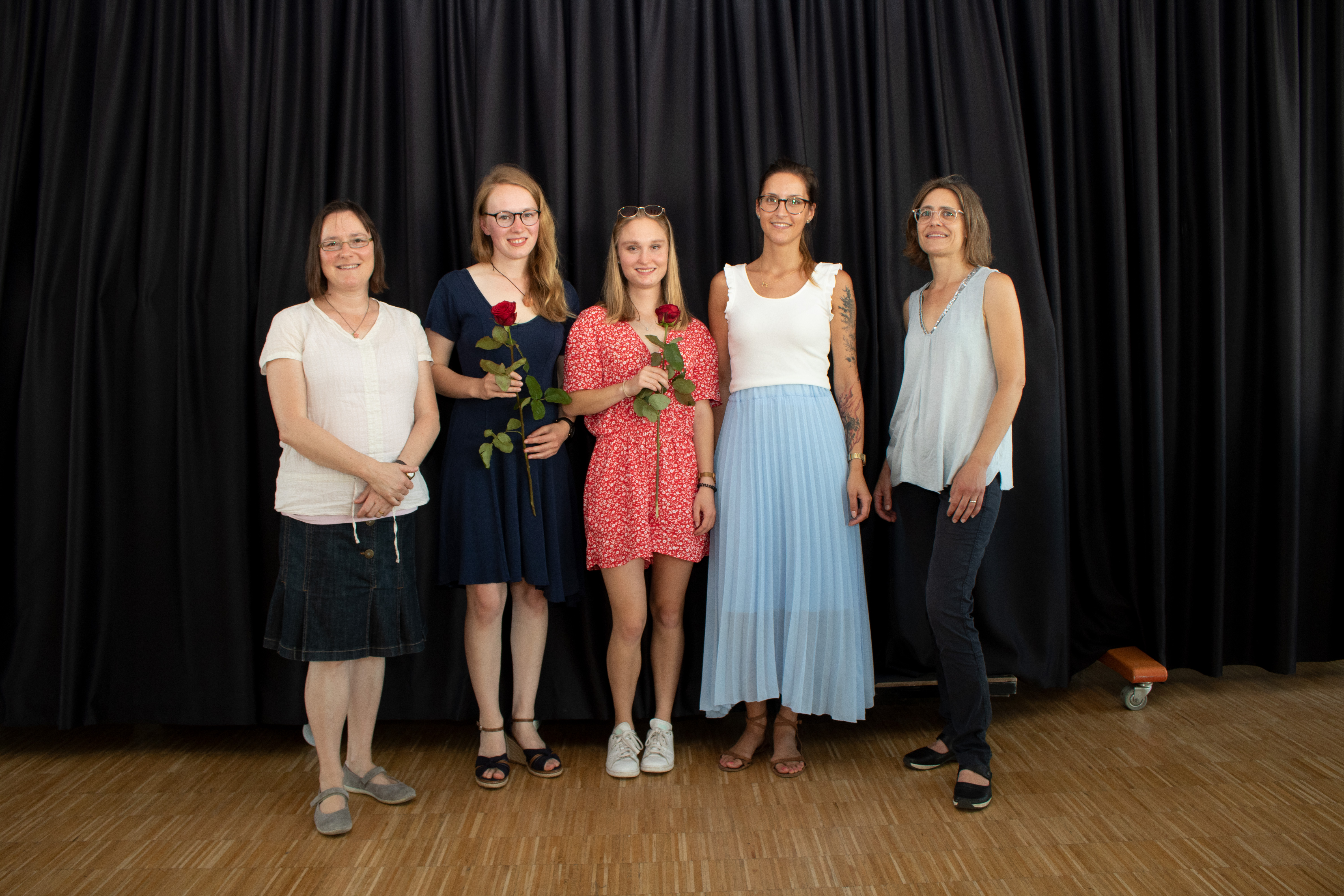 Zwei der Absolvent*innen (2. und 3. von links) mit drei ihrer Dozentinnen bei der Zeugnisvergabefeier.