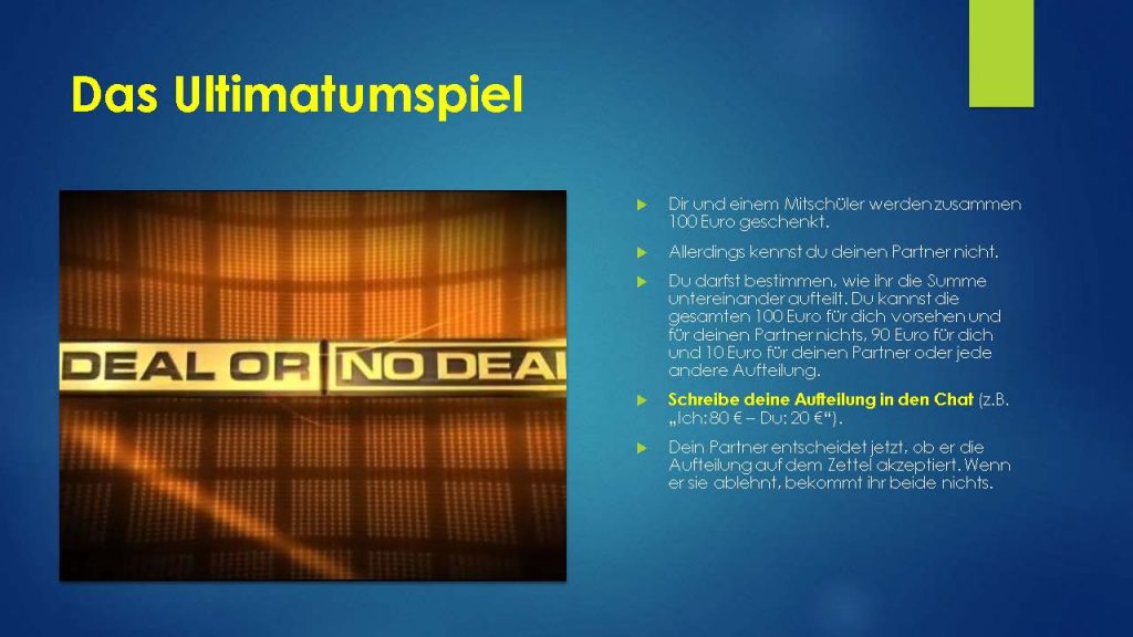 Im Anschluss daran ging es mit wirtschaftlichen Themen bei Thomas Weißinger, Fachlehrer in Volks- und Betriebswirtschaftslehre, weiter. Hierzu gehörte das "Ultimatumspiel" und die Bedeutung des "Homo Ökonomicus". Dass auch die Mathematik eine Rolle im Profilfach am WG spielt, wurde allen Teilnehmer*innen deutlich, als es um die Inhalte "Rechnungswesen" sowie "Finanzierung und Investitionen" aus der Jahrgangsstufe 1 ging.