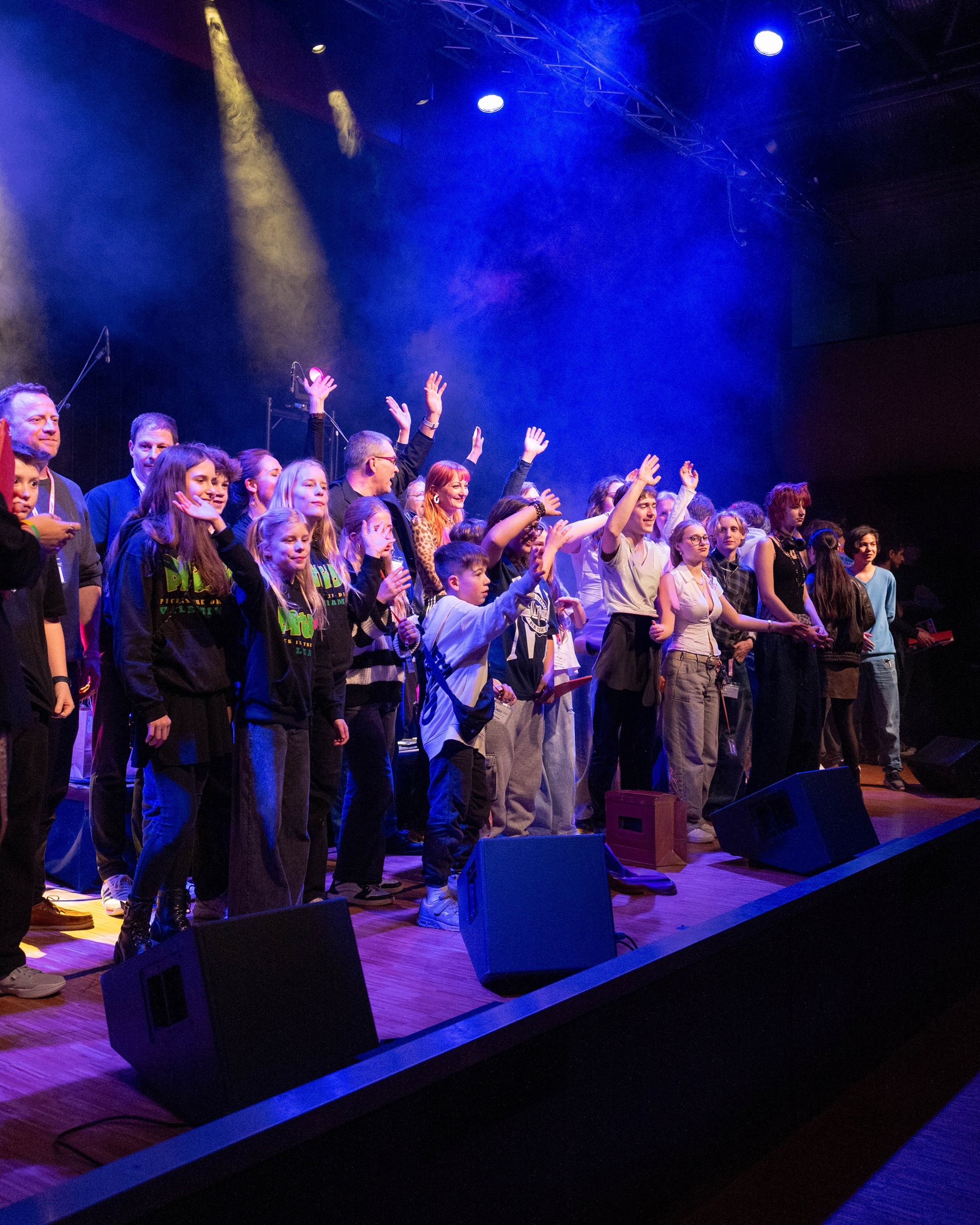 Foto 2: Hoch die Hände: Gruppenbild aller Bands und Coaches bei der Preisverleihung.