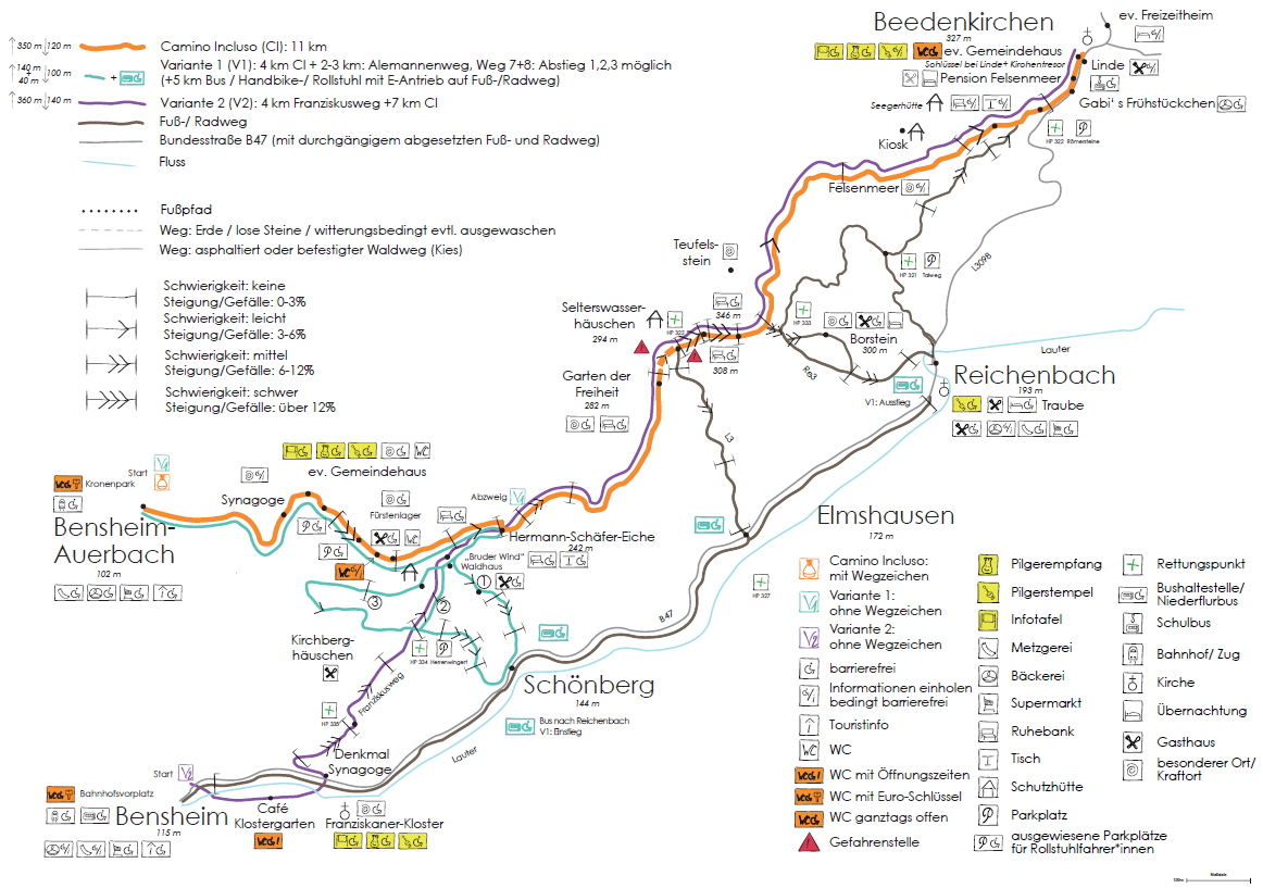 Neben den vielfältigen Naturerlebnissen kreuzen interessante Kirchen, eine Synagoge und ein Buddha-Tempel den interreligiösen Pilgerweg. Weitere Sehenswürdigkeiten und manche Freibäder in der Nähe locken ebenfalls. Der Pilgerweg ist mit einem gelbem Pilgerbeutel ausgezeichnet. Auf der App Komoot sind bereits alle Etappen hinterlegt. Ist ein Rollstuhlfahrer auf dem Camino Incluso unterwegs, wird die Begleitung von zwei Fußgängern empfohlen, da manche Höhenmeter überwunden werden müssen.