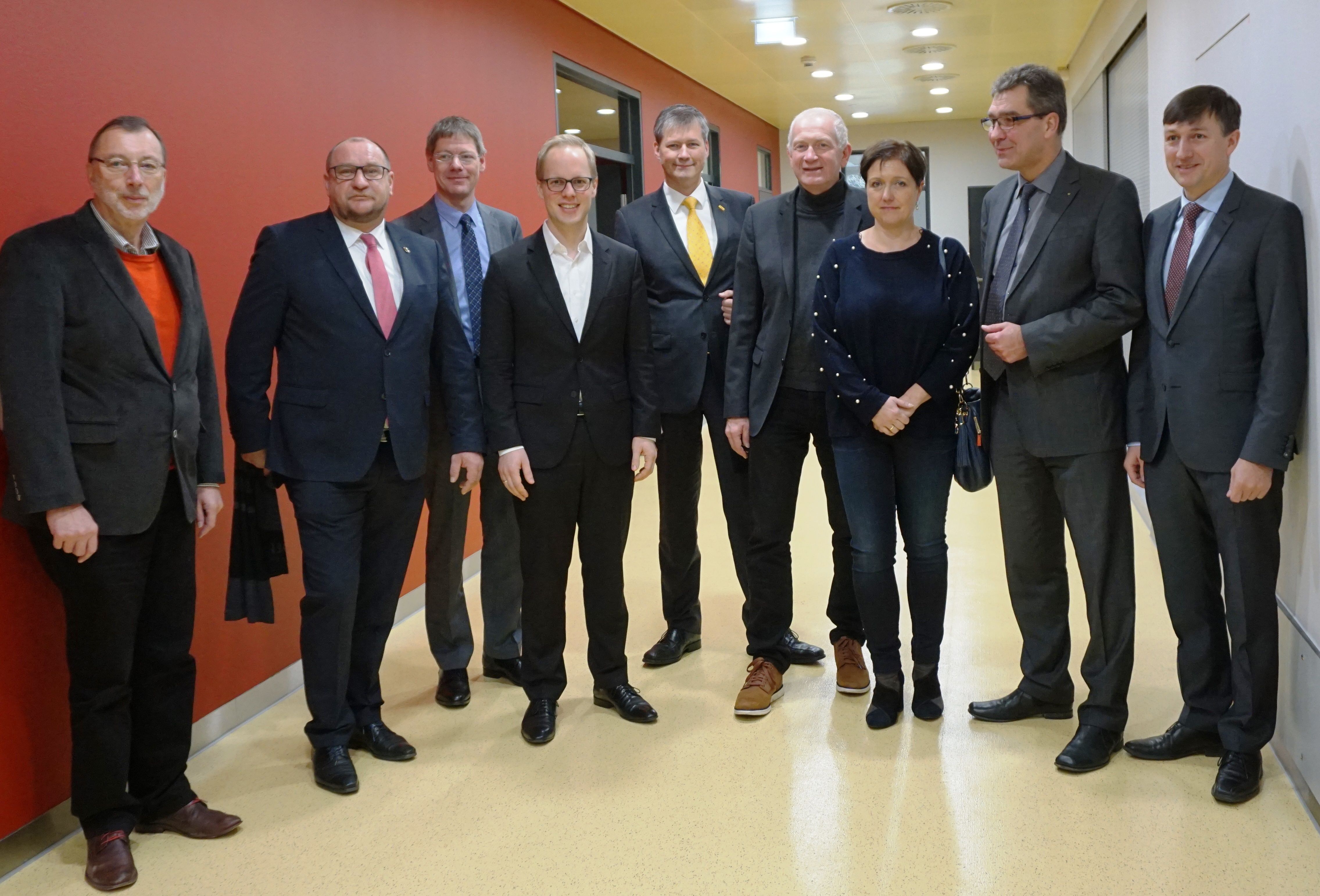 Volker Moessinger, stellvertretender Schulleiter der SRH Stephen-Hawking-Schule; Klaus Hoher, MdL FDP/DVP Fraktion; Michael Knöthig, Schulleiter; Dr. Jens Brandenburg, MdB für die FDP; Winrich Germann, Ortsverbandsvorsitzender der FDP; Thomas Bohnert, Schulleiter der SRH Stephen-Hawking-Schule; Petra Karus-Veccio, Elternvertreterin der SRH Stephen-Hawking-Schule; Dr. Tobias Böcker, Geschäftsführer der SRH Schulen; Harald Paulsen, Parlamentarischer Berater im Landtag.