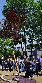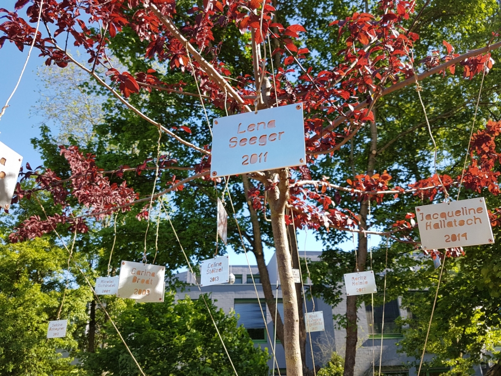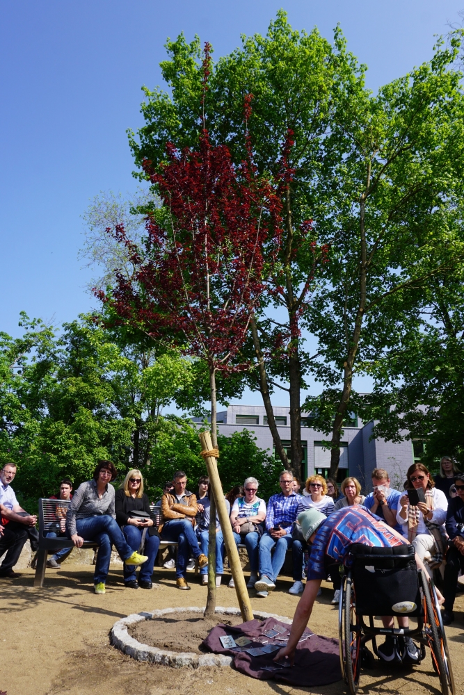 Auf jedem Plättchen steht ein Name und ein Jahr. Schüler und Mitarbeiter legen sie nacheinander an den Stamm einer frischgepflanzten Blutpflaume, an deren Ästen diese Schilder aufgehängt werden sollen. Die Schilder erinnern an Schüler, die aufgrund der Besonderheiten ihrer Behinderung oder Erkrankung während ihrer Schulzeit an der inklusiven SRH Stephen-Hawking-Schule verstorben sind. 18 Schülerinnen und Schüler sind es seit 2004. Der „Ort der Erinnerung“ direkt neben dem Schulgarten soll den Trauernden zeigen, dass niemand vergessen oder mit seinen Gedanken allein ist. „Es ist ein Andenken an die gute Zeit mit Mitschülern und Freunden“, sagt Birkan, der in seiner Klassengemeinschaft über den Gedenkort gesprochen hat. Es ist ein Ort, „um meine Gedanken, Gefühle, alles was mir durch den Kopf geht, zu sortieren“, sagt er. Und: Es ist „ein Platz, an dem ich Menschen kennengelernt habe, die mir wichtig sind“. Und: „Es ist ein Ort, um die Erinnerung wach zu halten“, sagt Birkan, auch stellvertretend für seine Mitschüler.